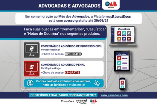Em comemoração ao Mês da Advocacia, a Editora Juruá oferece acesso gratuito à Plataforma JuruáDocs para as obras “Comentários ao Código de Processo Civil” e “Comentários ao Código Penal”. Basta acessar a plataforma e usar as respectivas chaves para acessar os produtos: “CPC-GRATIS” e “CP-GRATIS”; o acesso estará liberado até o dia 30/09/2021.