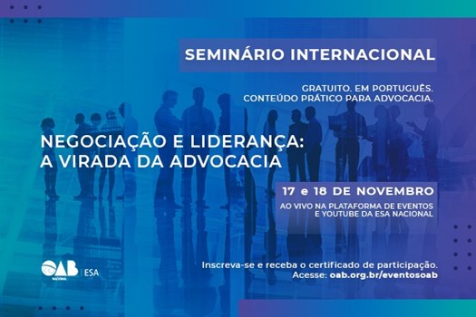 A OAB Nacional e a Escola Superior de Advocacia (ESA Nacional) promoverão um seminário internacional sobre “Negociação e Liderança – a virada da advocacia”, entre os dias 17 e 18 de novembro, com a participação de renomados especialistas em negociação estratégica, mediação judicial e advocacia resolutiva.