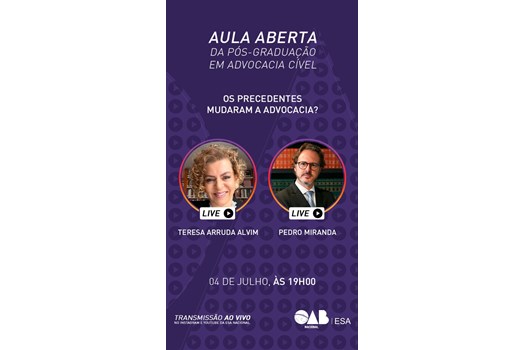 A primeira aula aberta de julho da pós-graduação em Advocacia Cível promovida pela Escola Superior de Advocacia (ESA Nacional) será realizada nesta quarta-feira (4/7), a partir das 19h, com transmissão ao vivo nos canais da ESA no YouTube e no Instagram. A palestrante será a advogada Teresa Arruda Alvim, que desenvolverá a aula a partir da pergunta-tema “Os precedentes mudaram a advocacia?”. O diretor-geral da ESA-SC, Pedro Miranda, será o apresentador.