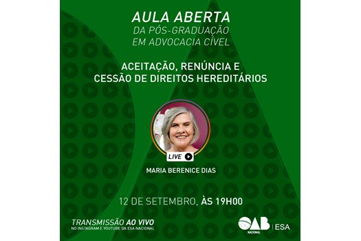 A Escola Superior de Advocacia Nacional (ESA Nacional) realiza hoje (12/9), às 19h, aula aberta da pós-graduação em ‘Advocacia Cível’. A aula será transmitida ao vivo pelo YouTube e Instagram da ESA Nacional, simultaneamente, com o tema “Aceitação, Renúncia e Cessão de Direitos Hereditários”.