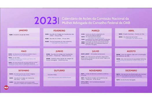 As diretoras das comissões da Mulher Advogada (CMA) se reuniram, na segunda-feira (13/02), para apresentar o calendário de ações que serão realizadas ao longo de 2023. O encontro foi virtual, comandado pela presidente da Comissão Nacional da Mulher Advogada (CMNA), Cristiane Damasceno.