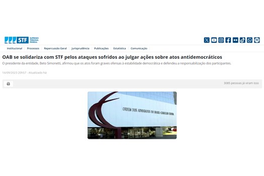 "Trago a esta sessão de abertura do Ano Judiciário a saudação de 1 milhão e 300 mil advogados e advogadas do Brasil. Zelamos pelas liberdades e garantias individuais, como a ampla defesa e o acesso à Justiça, que são primados do Estado Democrático de Direito. A defesa desses valores nos motiva a atuar contra os atos violentos e antidemocráticos que tentaram enfraquecer as instituições da República e a Constituição Federal. Dizemos Sim às divergências e ao debate de ideias. Dizemos Não à depredação, à ameaça e à tentativa de colocar fim à democracia. O Brasil conviveu, em diferentes momentos, com o julgo e a espada do autoritarismo. Nesses momentos, que ficaram no passado, o país contou com integrantes do sistema de Justiça e da sociedade civil para sustentarem as esperanças de democracia." (Beto Simonetti, na abertura do Ano Judiciário no STF em 1º de fevereiro de 2023)