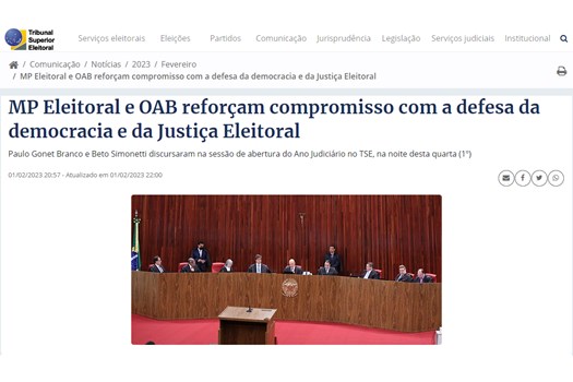 "Nós confiamos no Poder Judiciário e na Justiça Eleitoral. Refutamos teses conspiratórias que tentam propagar o caos e desacreditar as urnas eletrônicas. Tenho muito orgulho, neste ano eleitoral, de ocupar esta tribuna na condição de presidente nacional da OAB, a maior instituição civil do país." (Beto Simonetti, na abertura do Ano Judiciário de 2024 no TSE, em 1° de fevereiro de 2024)